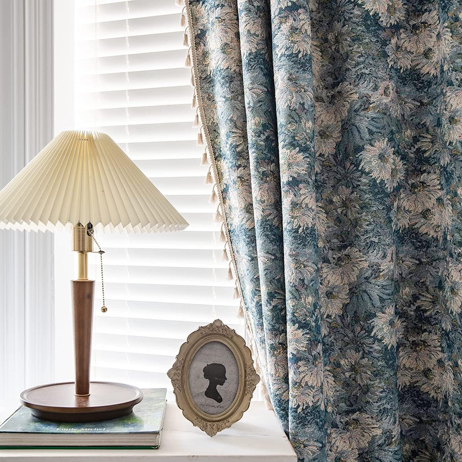 Blue Floral Curtains 84 Inch Length 2 Panels Semi Sheer Drapes for Living Room Bohemian Rustic Rod Pocket Window Curtain Panels with Tassel Jacquard Bedroom Window Treatments